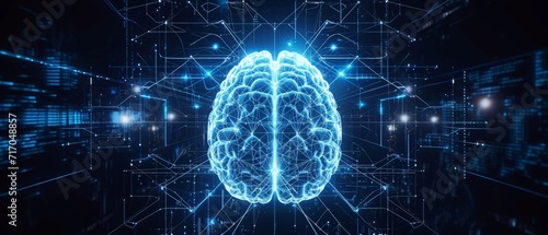 Wall mural : A brain with lights and symbols on a dark background generative ai
