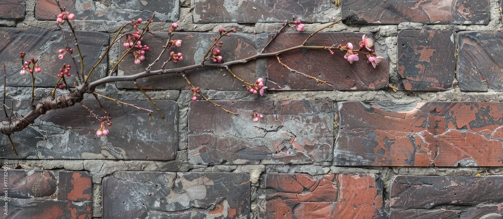 A branch of a flowering tree rests on a brick tile pathway spring theme - copy space image - place forWall mural
