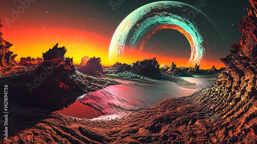 The watermark will not be included on Wall mural.: A breathtaking planet under a bright orange sky creating a surreal and dreamlike atmosphere with moo