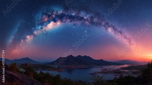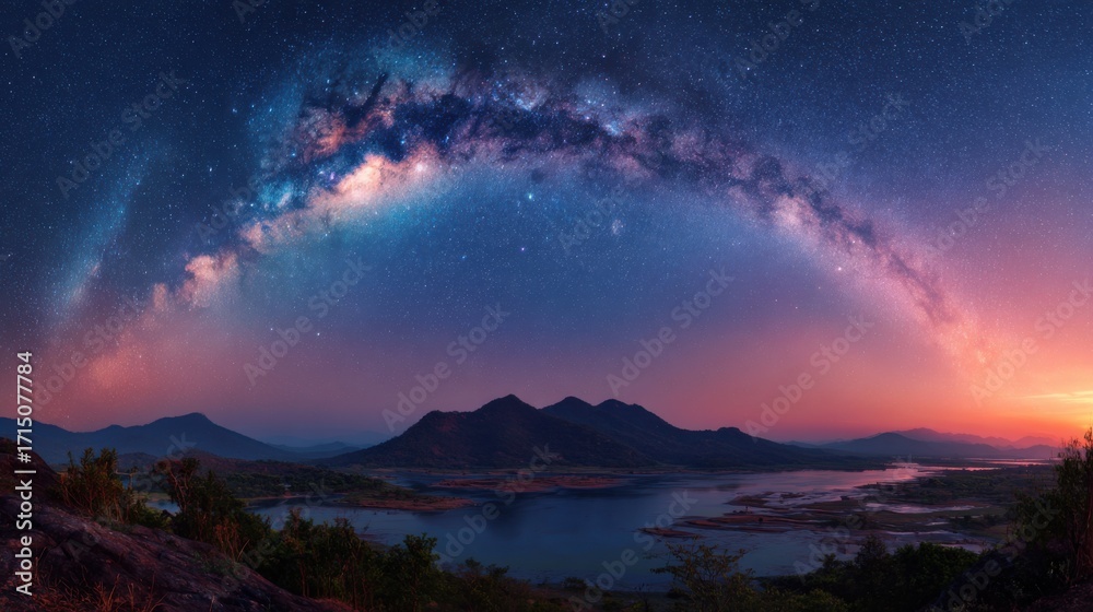 The watermark will not be included on Wall mural.: A breathtaking view of the night sky filled with stars and the milky way arching over rolling mounta