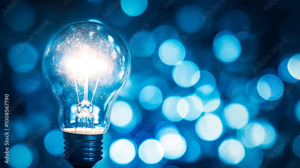 The watermark will not be included on Wall mural.: A bright light bulb shines against a dark background -