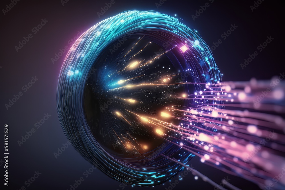 The watermark will not be included on Wall mural.: A bundle of thin translucent fibers glowing with data signals in vibrant colors - generative ai
