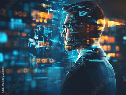The watermark will not be included on Wall mural.: A business professional examines a complex array of digital information and graphics, fully engaged