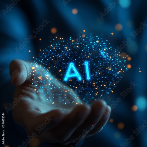 Wall mural a business professional in a dark blue shirt is touching an text "ai" icon with various tech symbols - Wall murals Wall mural a business professional in a dark blue shirt is touching an text "ai" icon with various tech symbols - Wall murals
