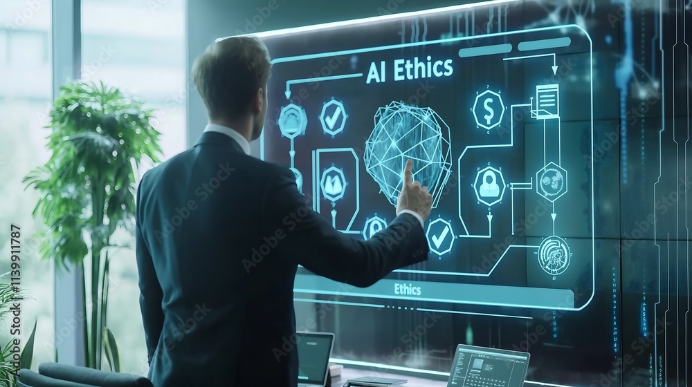 Wall mural : A business professional in a modern office interacting with an augmented reality screen displaying a