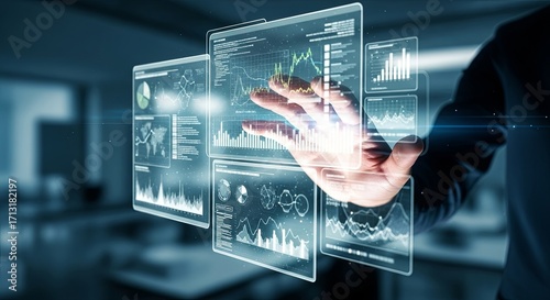 Wall mural a business professional interacts with futuristic holographic touchscreens displaying complex data a