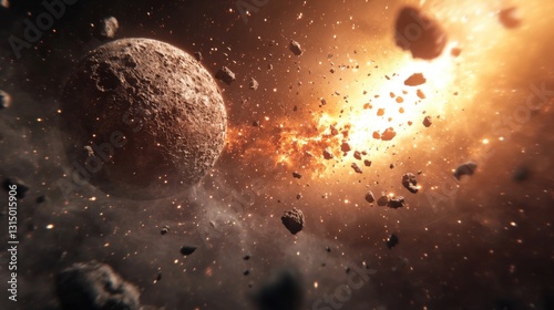 The watermark will not be included on Wall mural.: A captivating cosmic environment showcases a planet surrounded by a dense field of asteroids and vib