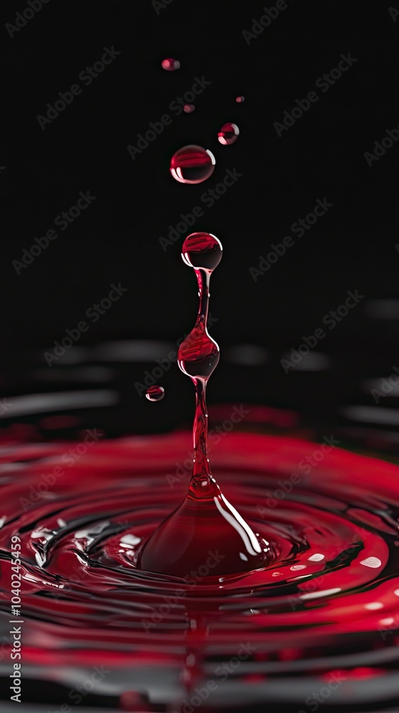 The watermark will not be included on Wall mural.: A captivating drop of red liquid splashes in a dark environment, creating an elegant ripple effect -