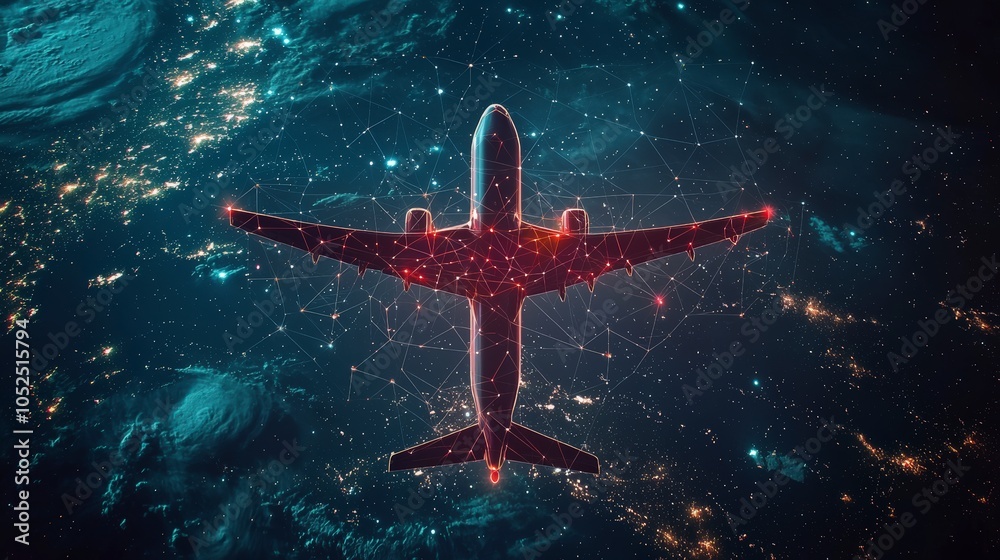 Wall mural a captivating image of an airplane digitally connected while flying above the earth, illustrating th - Wall murals Wall mural a captivating image of an airplane digitally connected while flying above the earth, illustrating th - Wall murals