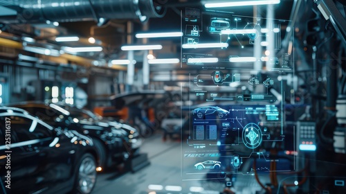 Wall mural a car is shown in a factory with a computer screen displaying a car's engine - Wall murals Wall mural a car is shown in a factory with a computer screen displaying a car's engine - Wall murals