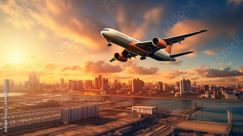 Wall mural a cargo plane takes off over the ocean to pick up shipping containers. it's a way to manage logistic - Wall murals Wall mural a cargo plane takes off over the ocean to pick up shipping containers. it's a way to manage logistic - Wall murals