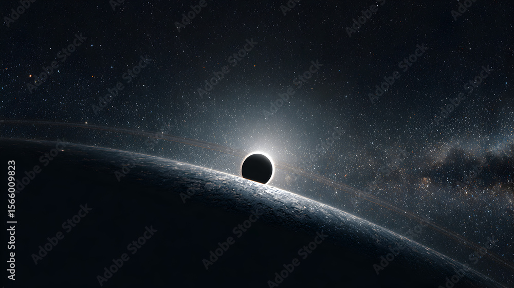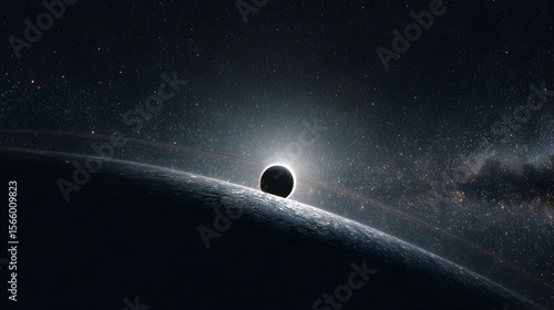 Wall mural a celestial eclipse viewed from a planet surface with stars and galaxy in the background light shini - Wall murals Wall mural a celestial eclipse viewed from a planet surface with stars and galaxy in the background light shini - Wall murals