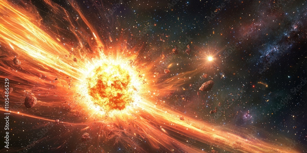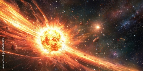 Wall mural a celestial event in a distant galaxy, with supernovae exploding, new stars forming, and cosmic wave - Wall murals Wall mural a celestial event in a distant galaxy, with supernovae exploding, new stars forming, and cosmic wave - Wall murals
