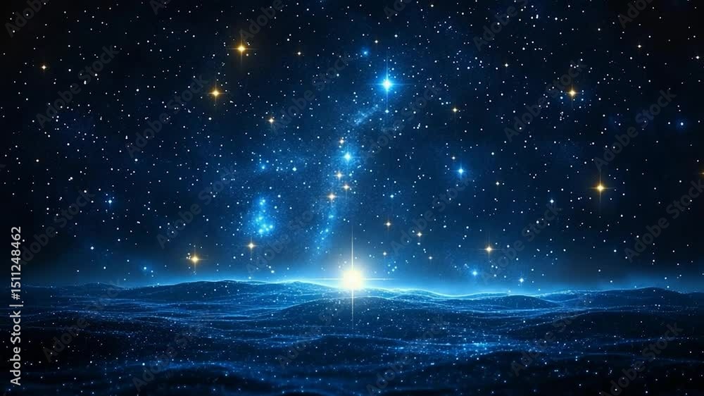 Wall mural : A celestial landscape features a starry night sky with a luminous central point and a textured blue