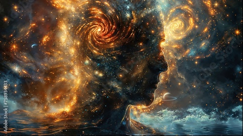 Wall mural a celestial profile sets over an ocean brimming with cosmic activity, merging man with the universe