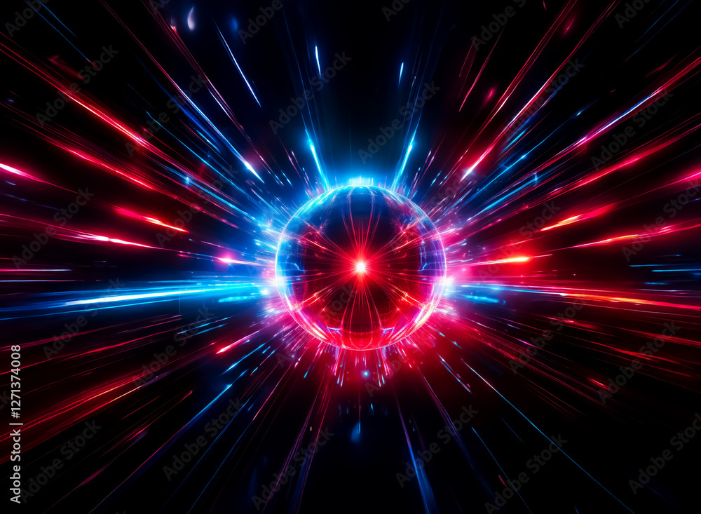 Wall mural a central sphere emits vibrant red and blue rays against a dark backdrop, creating a dynamic visual