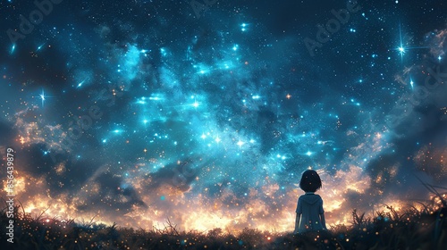 Wall mural a child gazing at the stars with wonder, representing the calming effect of connecting with the beau - Wall murals Wall mural a child gazing at the stars with wonder, representing the calming effect of connecting with the beau - Wall murals