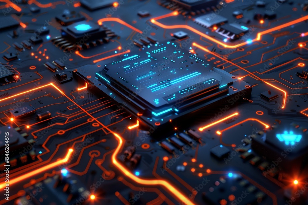 The watermark will not be included on Wall mural.: A circuit board with orange and blue glowing lines and numbers floating above it -