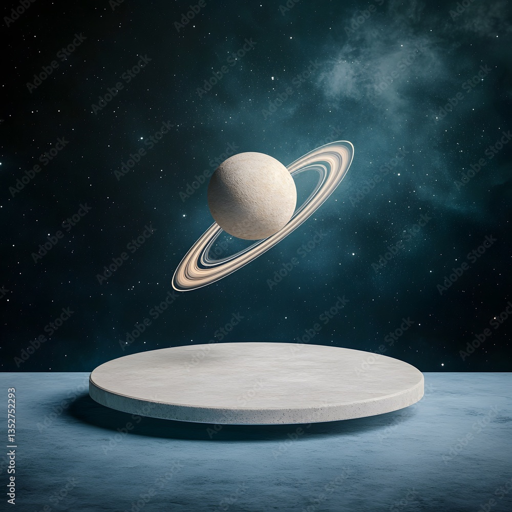 The watermark will not be included on Wall mural.: A circular podium, floating in an outer space setting with planetary rings