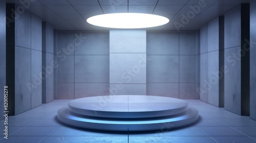 The watermark will not be included on Wall mural.: A circular podium in the center of the blue room - an empty showcase for displaying goods - 3d renderi