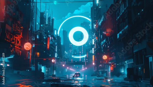 The watermark will not be included on Wall mural.: A cityscape with neon lights and a large circle in the middle by ai generated image