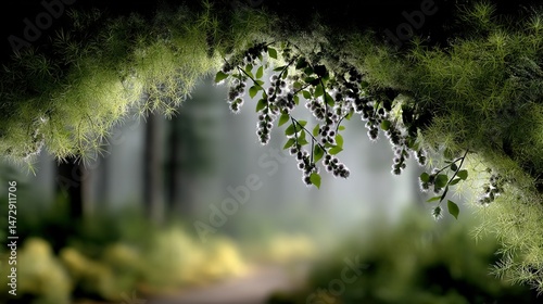 The watermark will not be included on Wall mural.: A clear picture of a forest trail with lush greenery dangling from the trees