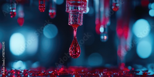 The watermark will not be included on Wall mural.: A close-up features a droplet of red liquid hanging from a pipette, within a detailed lab setting -
