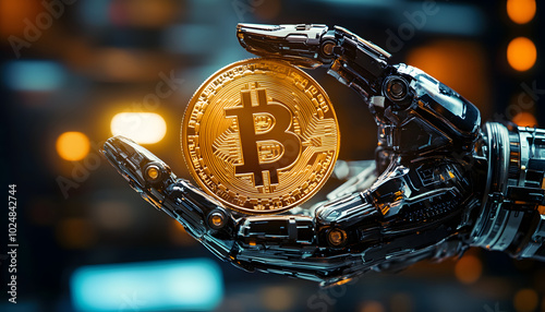 Wall mural a close-up image of a robotic hand holding a gleaming bitcoin coin. the background features futurist