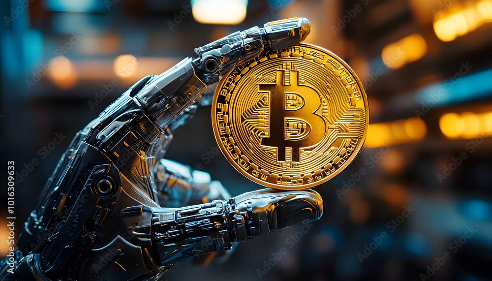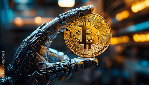 Wall mural a close-up image of a robotic hand holding a gleaming bitcoin coin. the background features futurist