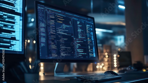 Wall mural a close-up of a computer monitor displaying lines of code in a dimly lit office.