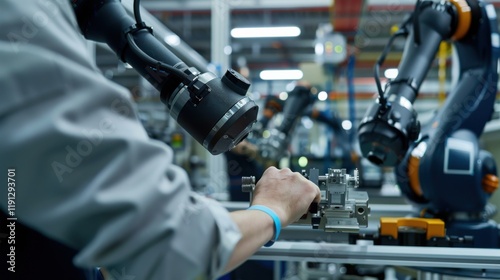 The watermark will not be included on Wall mural.: A close-up of a factory technician calibrating industrial robots on a production line, robotic calib