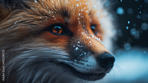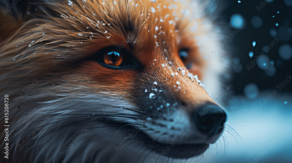 Wall mural : A close up of a fox's face with snow on its snout generative ai