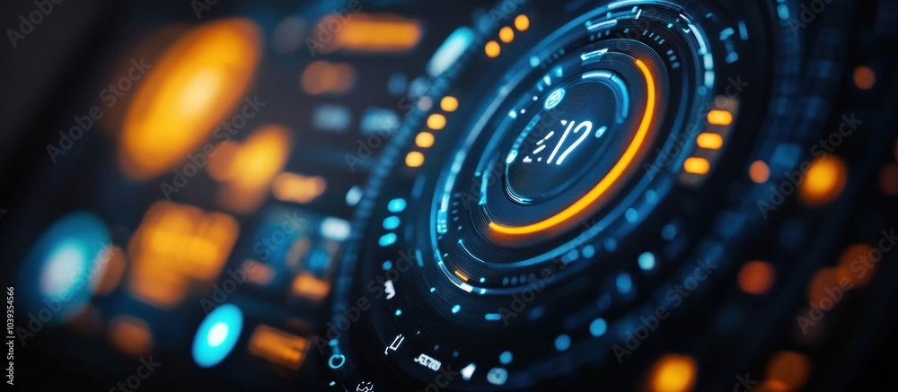 Wall mural : A close-up of a futuristic interface with a circular display showing the number 12 in an orange ring