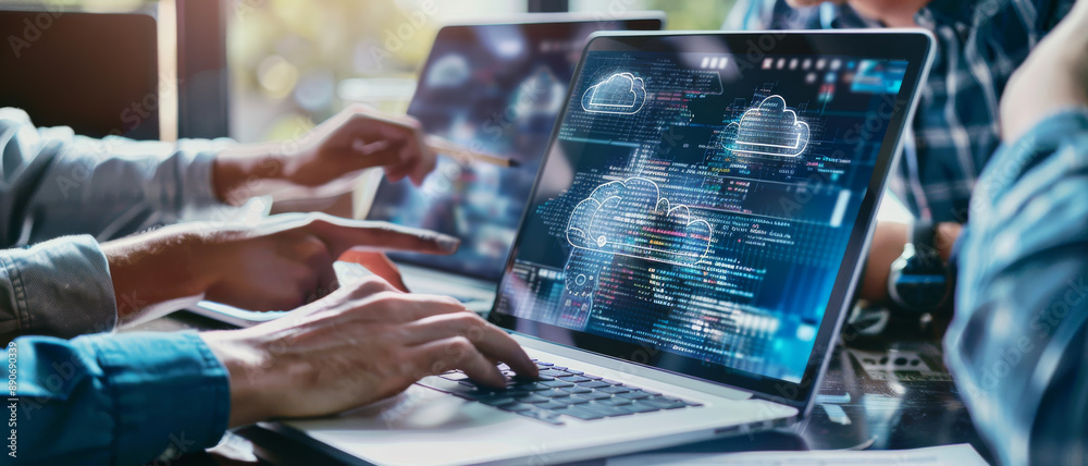 Wall mural a close-up of a laptop displaying cloud-related coding, with people collaborating beside it in a mod - Wall murals Wall mural a close-up of a laptop displaying cloud-related coding, with people collaborating beside it in a mod - Wall murals