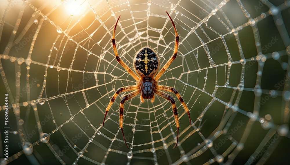 Wall mural a close-up of a spider using morning dew to weave a complex web
