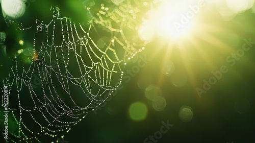 The watermark will not be included on Wall mural.: A close-up of a spider web glowing with the sun behind it in the background