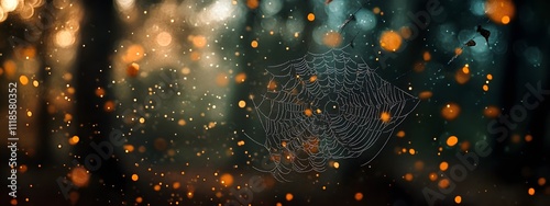 The watermark will not be included on Wall mural.: A close-up of a spider web in the forest, with blurred trees and bokeh effects creating a mysterious