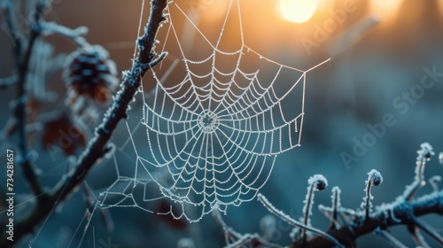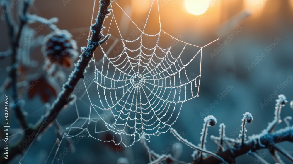 The watermark will not be included on Wall mural.: A close up of a spider web on a tree branch in the winter with the sun shining in the background -