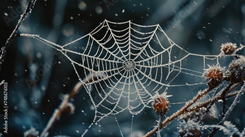 Wall mural a close up of a spider web on a tree branch with dew droplets on the spiderwefe's web.