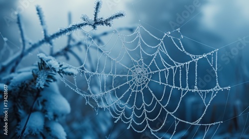 Wall mural : A close up of a spider web on a tree branch with water droplets on the spiderwefe's web -