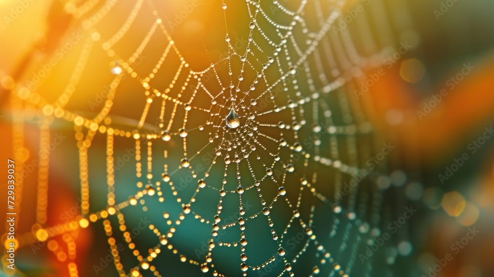 Wall mural a close up of a spider web with drops of dew on the spider's web in front of a blurry background of
