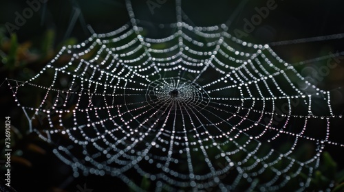 The watermark will not be included on Wall mural.: A close up of a spider web with drops of water on the spider's web in the center of the web -