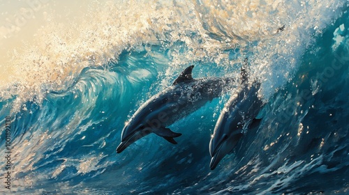 Wall mural a close-up of a wave with dolphins visible beneath the surface, their shapes adding a sense of life
