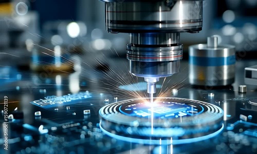 Wall mural a close-up of an advanced laboratory machine with blue laser lights shining on the surface, creating - Wall murals Wall mural a close-up of an advanced laboratory machine with blue laser lights shining on the surface, creating - Wall murals