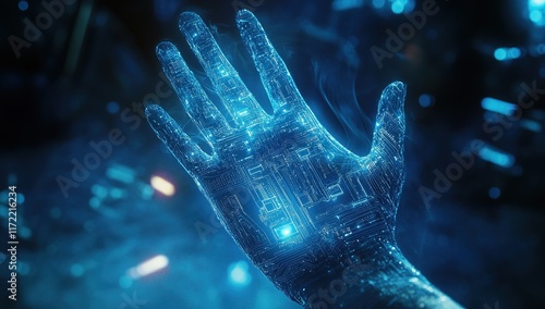 Wall mural : A close-up of an ai hand reaching out towards the viewer, with digital circuit patterns on its finge