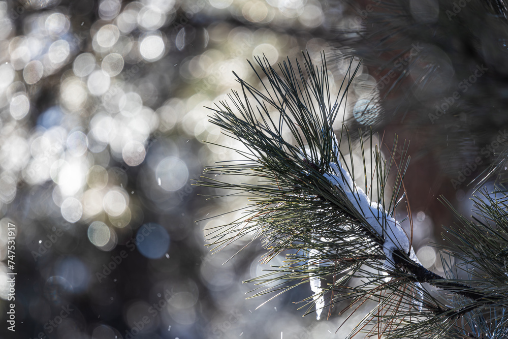 A close up of the needles of a pine tree with snow resting on the branchWall mural