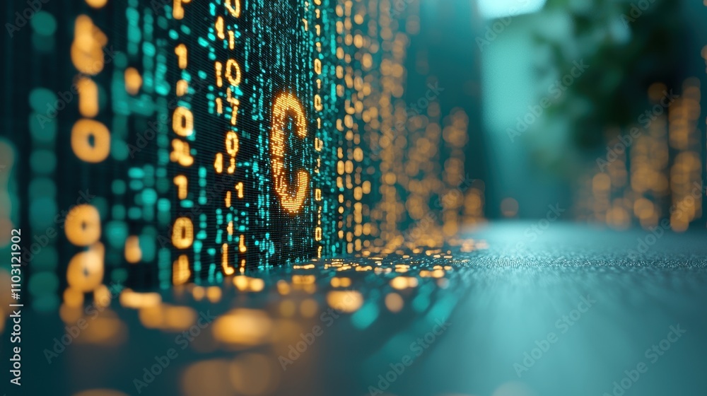 Wall mural a close up shot of a digital code stream with glowing characters and symbols, hinting at the underly - Wall murals Wall mural a close up shot of a digital code stream with glowing characters and symbols, hinting at the underly - Wall murals