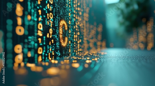 Wall mural a close up shot of a digital code stream with glowing characters and symbols, hinting at the underly