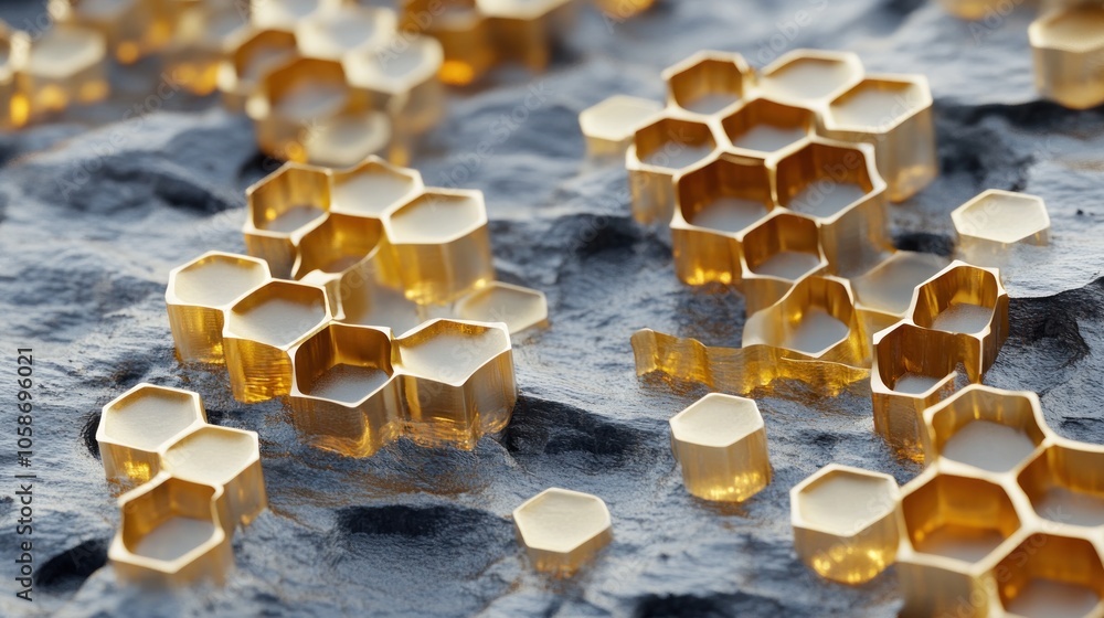 The watermark will not be included on Wall mural.: A close-up shot of a honeycomb pattern made of gold on a rough gray surface -