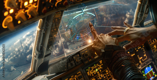 Wall mural : A close-up shot of a pilots hands interacting with a futuristic, advanced flight display inside the